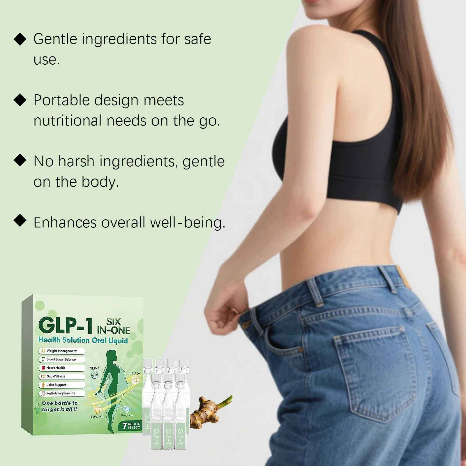This product is crafted with ingenuity, combining the antioxidant properties of green tea, the rich nutrition of Moringa seeds, the anti-inflammatory properties of turmeric, the precursor substances of NAD+, and the scientific ratio of GLP-1 promoter derived from natural plants. The various components are not simply stacked, but work together to form a powerful "health alliance", jointly supporting multiple health goals such as weight management, blood glucose metabolism, heart health, joint care, and anti-aging, achieving a comprehensive care of 1+1>2.