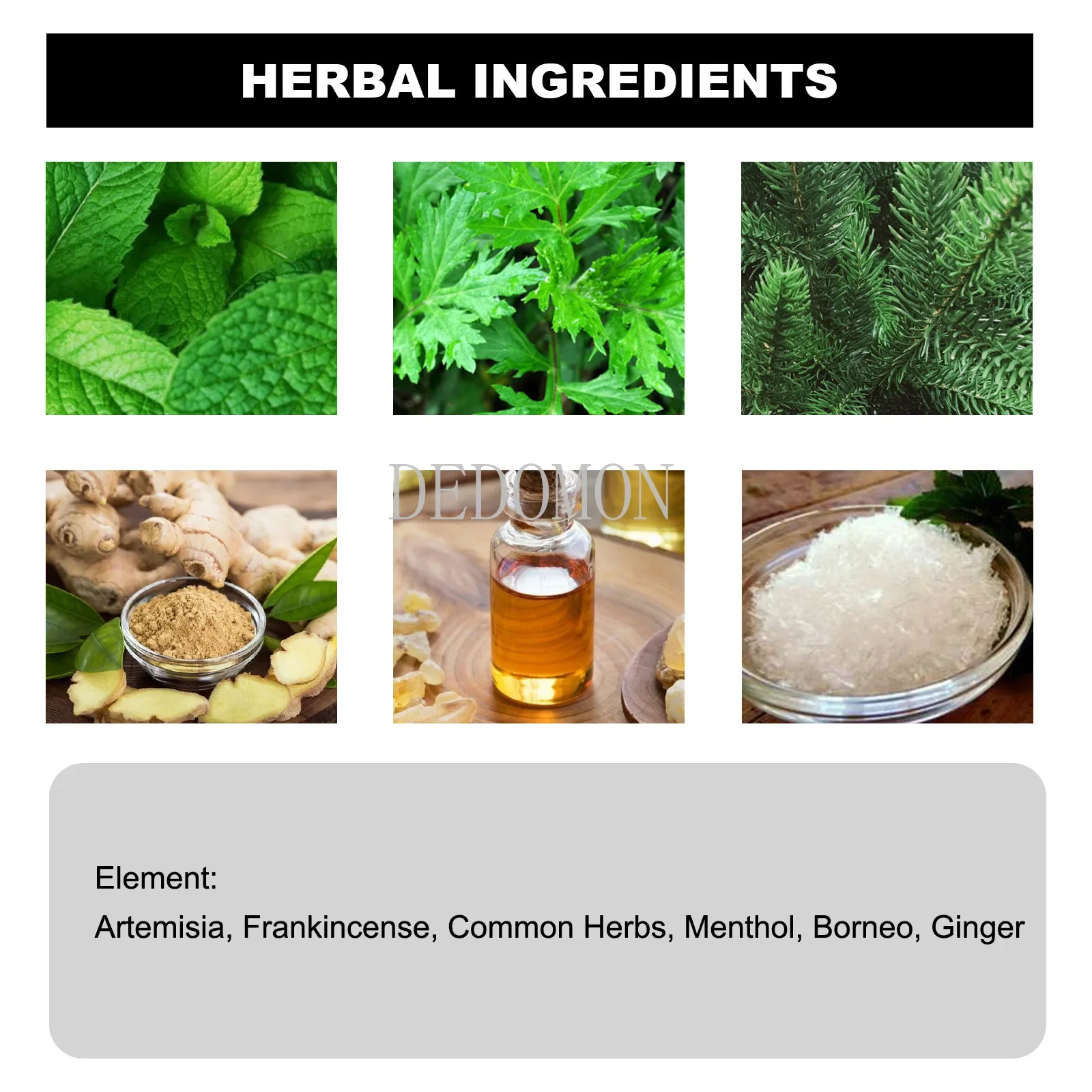 Artemisia,frankincense,commonherbs,menthol,borneo,ginger.